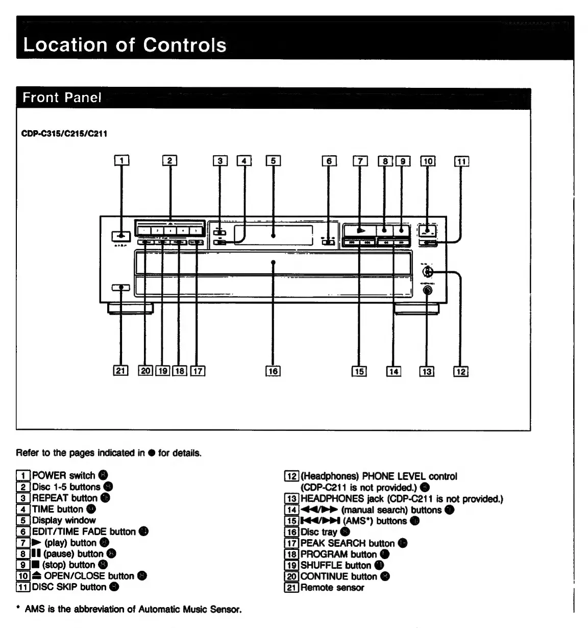 Sony CDP-C315 - Location of Controls; Front Panel Controls
