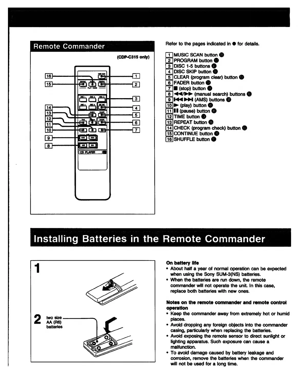 Sony CDP-C315 - Remote Commander Setup; Installing Remote Batteries