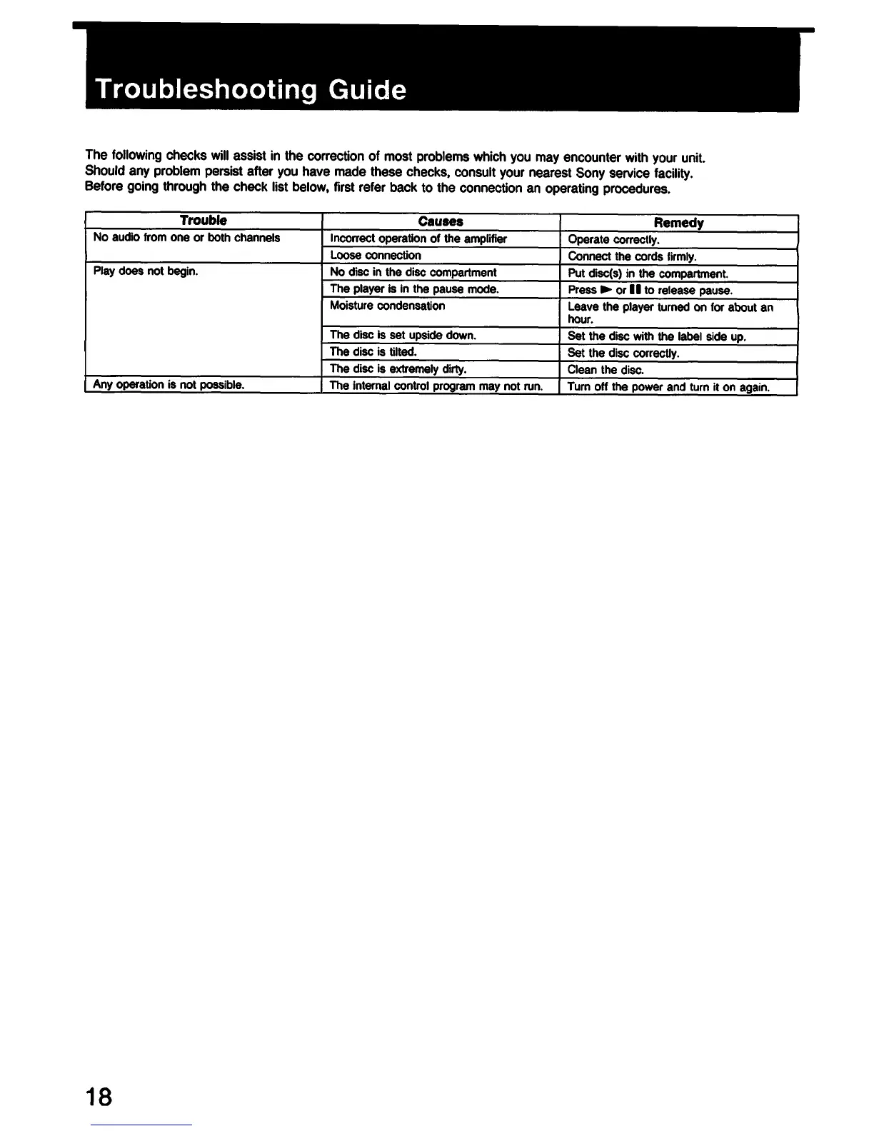 Sony CDP-C331 - Troubleshooting Guide; Trouble Diagnosis; Resolving Playback Issues; Resolving Operation Issues