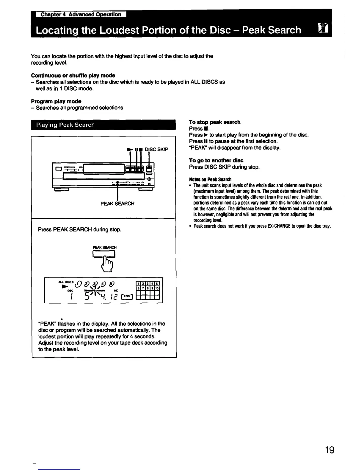 Sony CDP-C335 - Locating the Loudest Portion of the Disc - Peak Search; Playing Peak Search; To Stop Peak Search