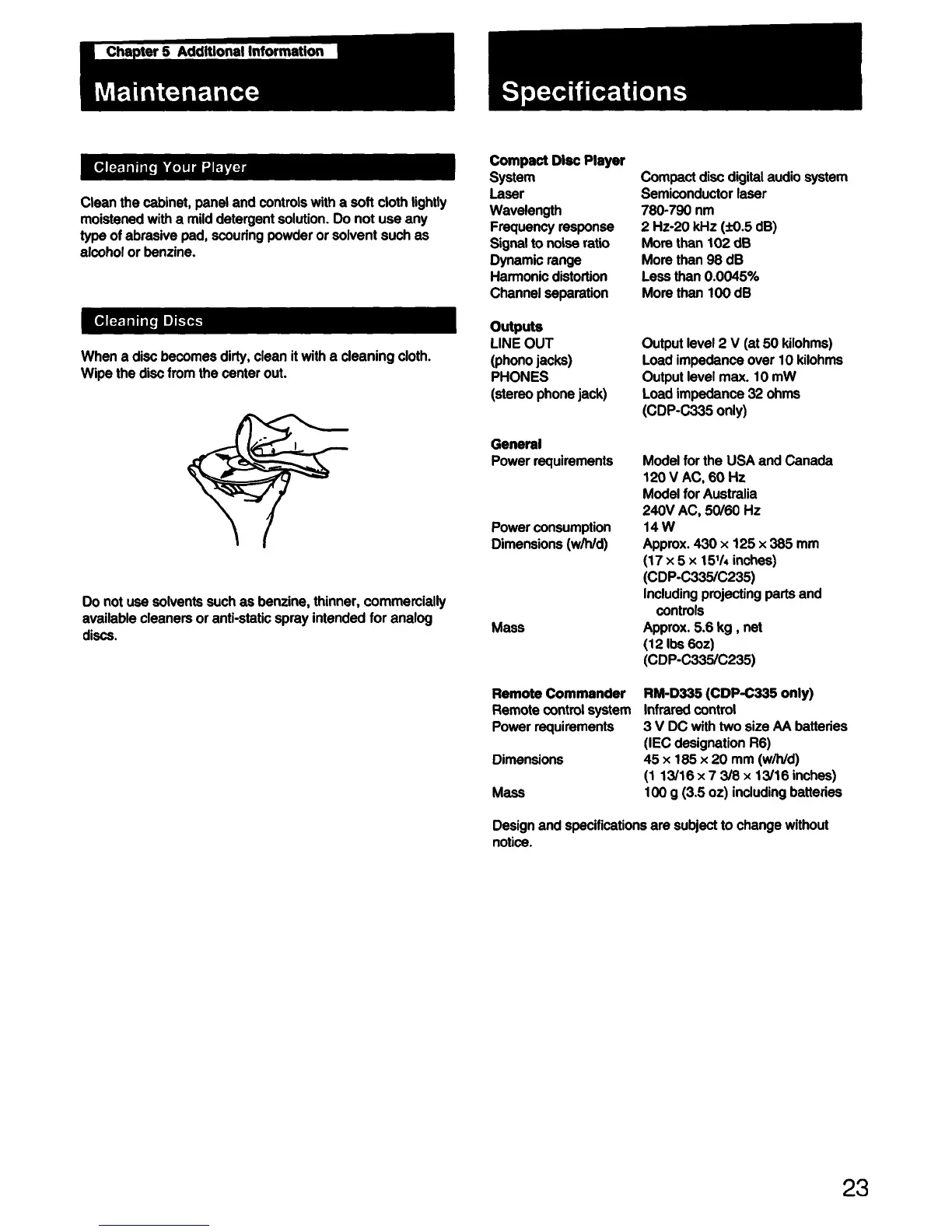 Sony CDP-C335 - Maintenance; Specifications; Cleaning Your Player; Cleaning Discs