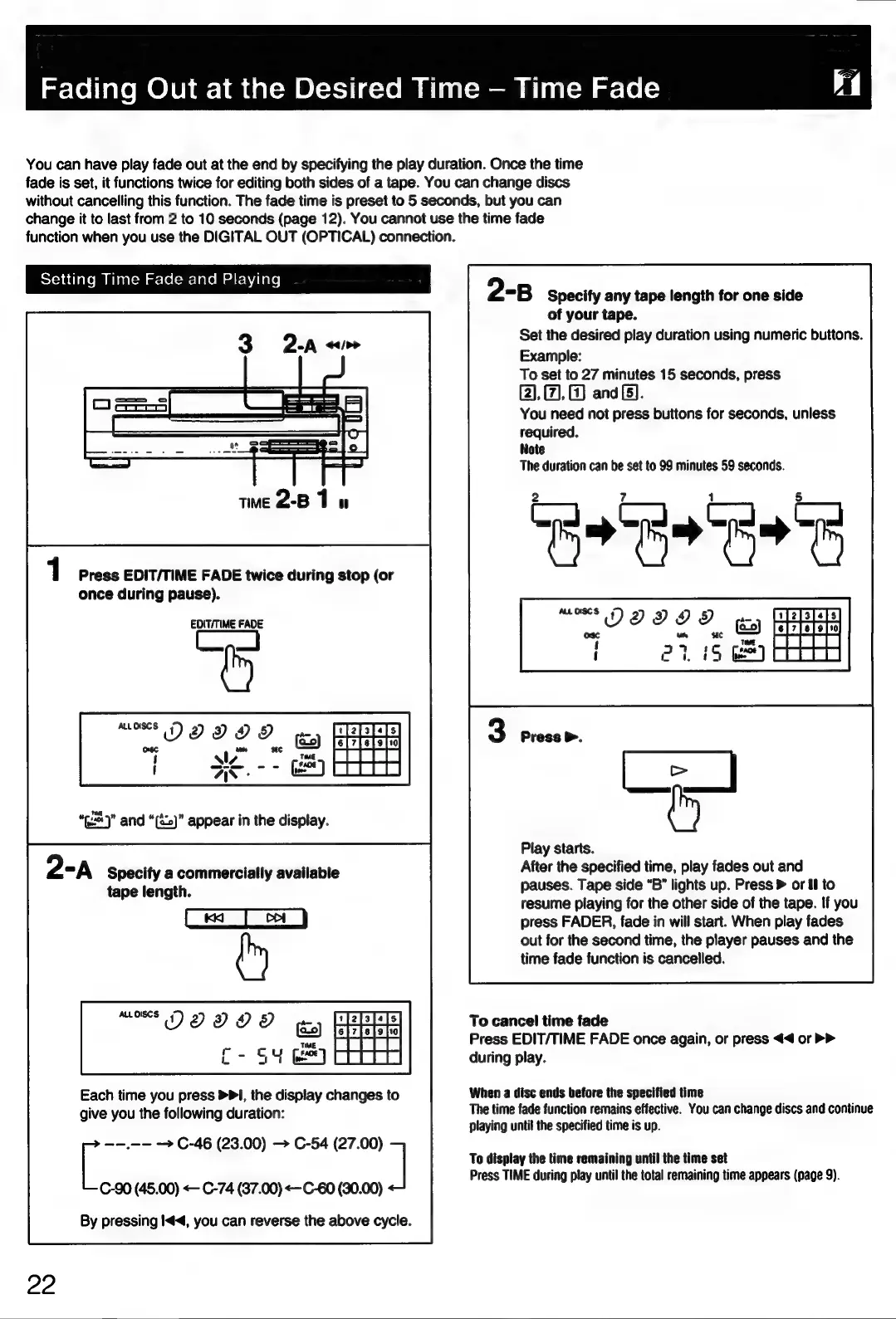 Sony CDP-C445 - Time Fade for Gradual Playback End; Setting and Executing Time Fade; Specifying Tape Duration for Fade; Cancelling Time Fade Function
