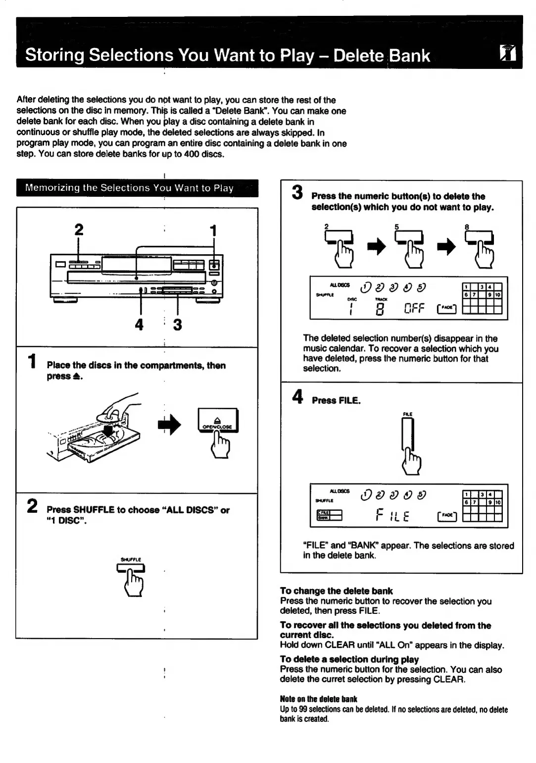 Sony CDP-C445 - Delete Bank for Storing Selections; Memorizing Selections to Retain; Using File and Bank Functions; Modifying and Recovering Delete Banks