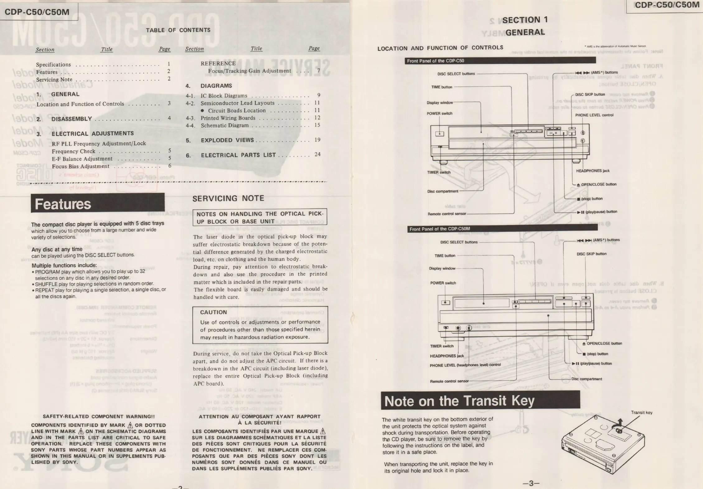 Sony CDP-C50M - Section 1 General; Location and Function of Controls; Features; Servicing Note: Optical Pick-Up Block Handling