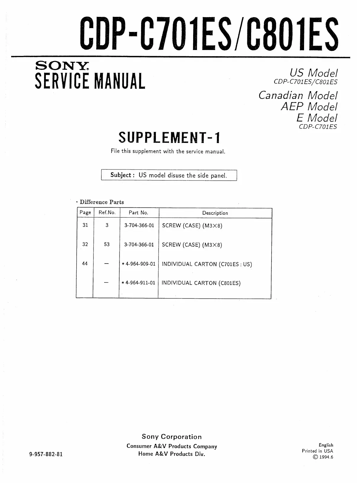 Sony CDP-C701ES - Service Manual Supplement; Supplement 1 - US Model Side Panel