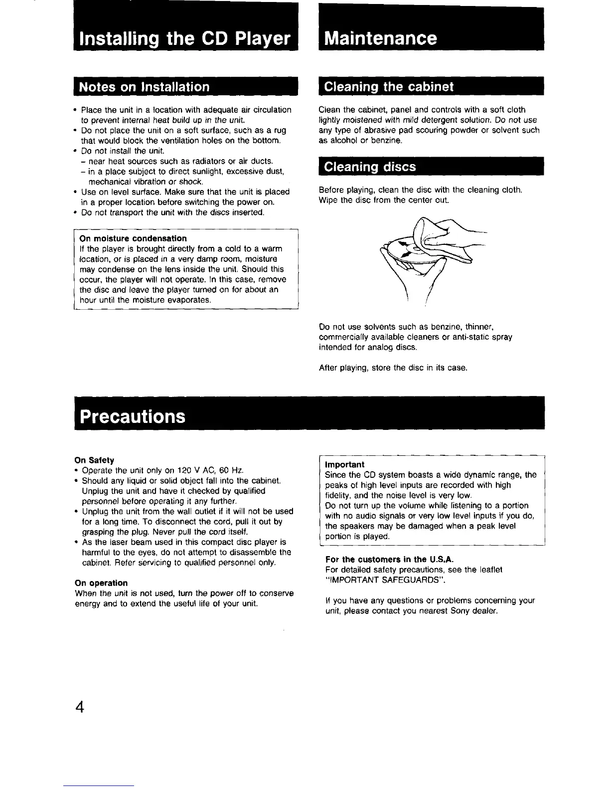 Sony CDP-C725 - Installing the CD Player; Installation Guidelines; Maintenance and Precautions; Safety Guidelines