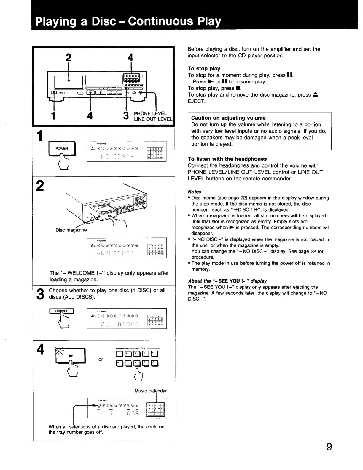 Sony CDP-C910 - Continuous Disc Playback; Playback Controls and Volume; Headphone Listening; Playback Notes and Displays