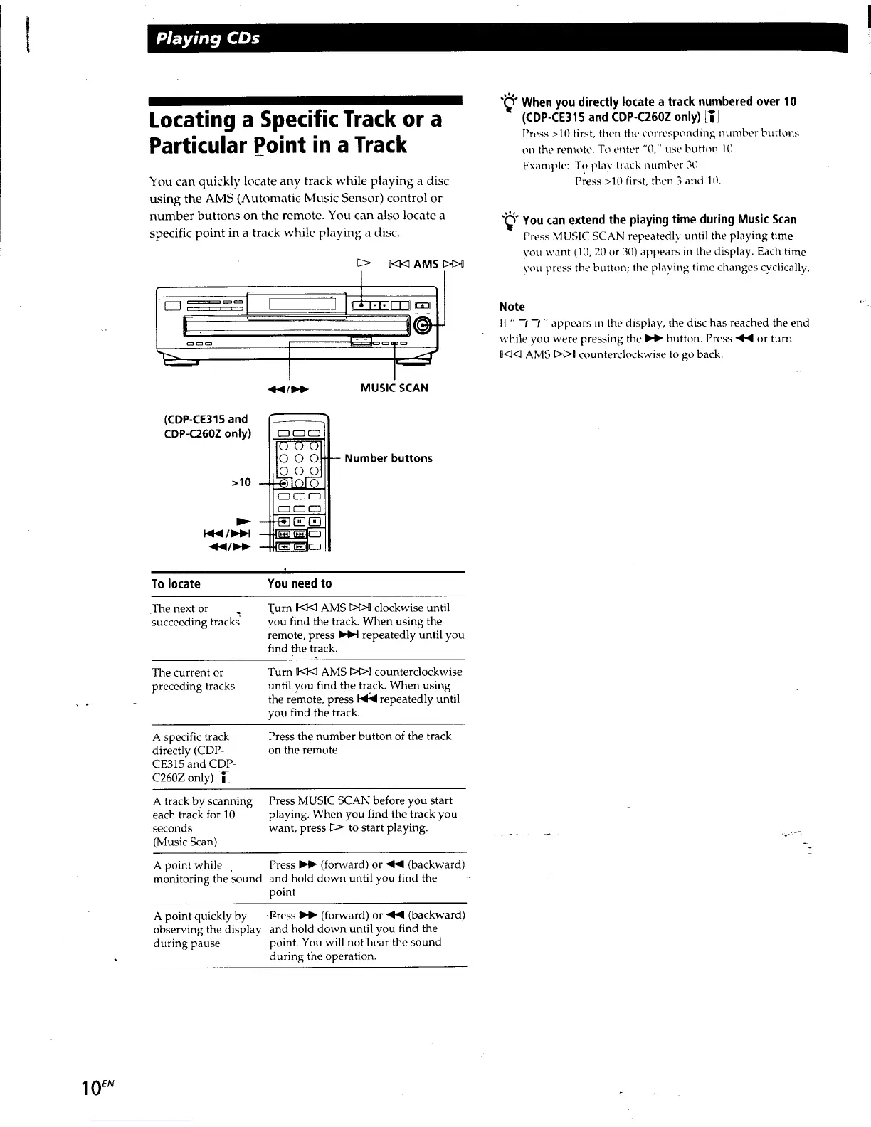 Sony CDP-CE215 - Locating Tracks and Playback Points; Finding Specific Tracks; Music Scan and Point Location
