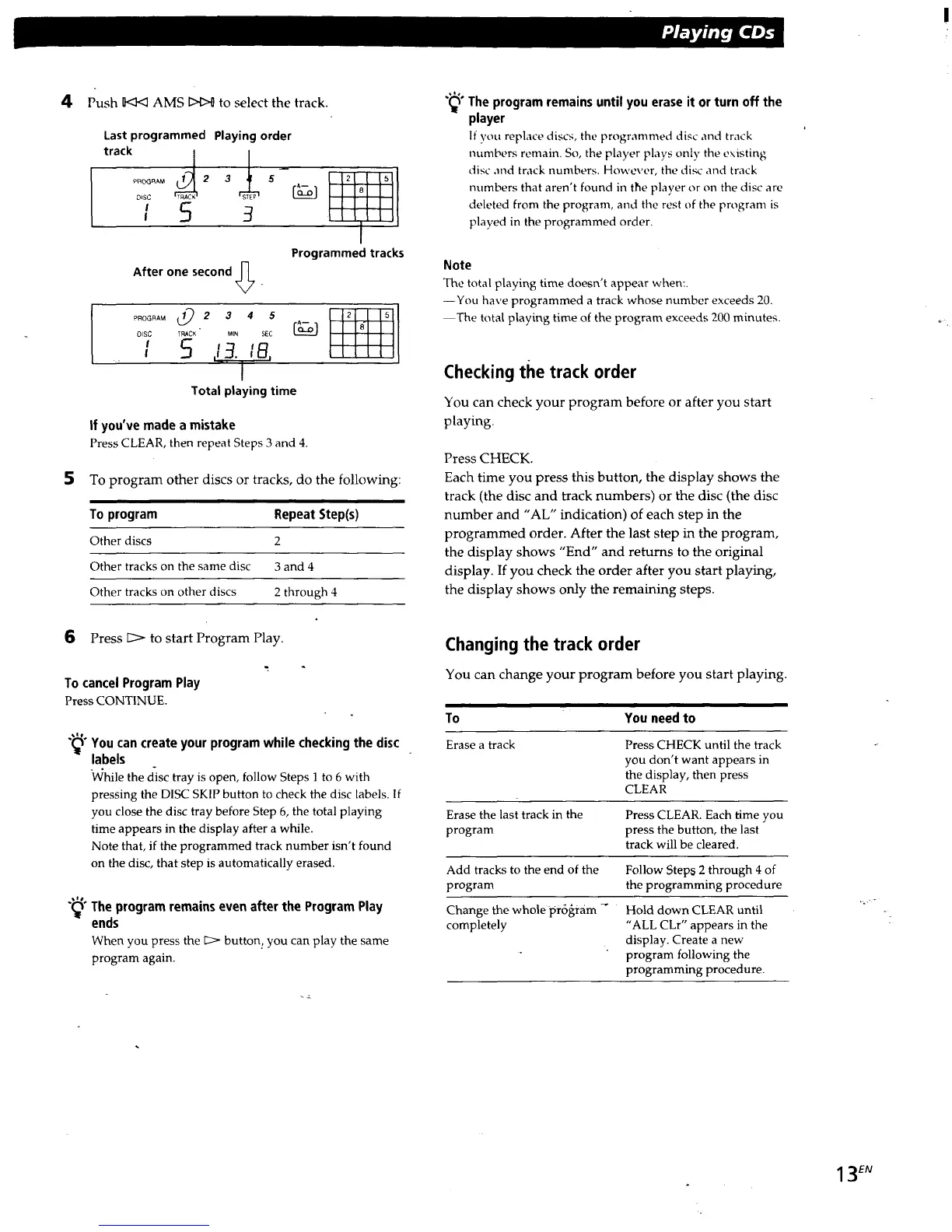Sony CDP-CE215 - Managing Program Play; Correcting Programming Errors; Checking and Changing Program Order