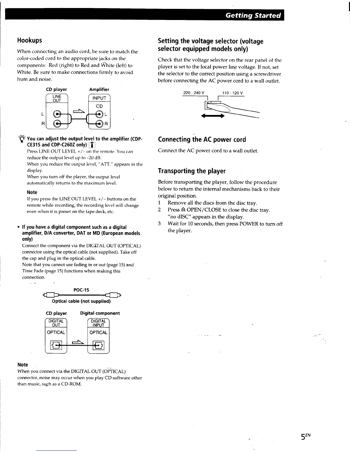 Sony CDP-CE215 - System Connections and Setup Procedures; Audio and Digital Connections; Voltage Selector and AC Power Connection; Player Transportation Preparation