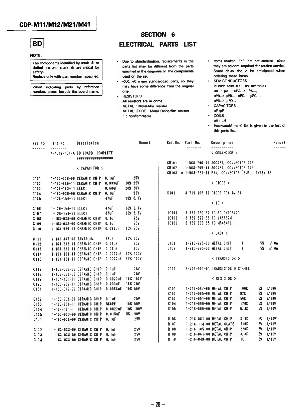 Sony CDP-M11 - Detailed Electrical Parts Lists; BD Board Component Breakdown
