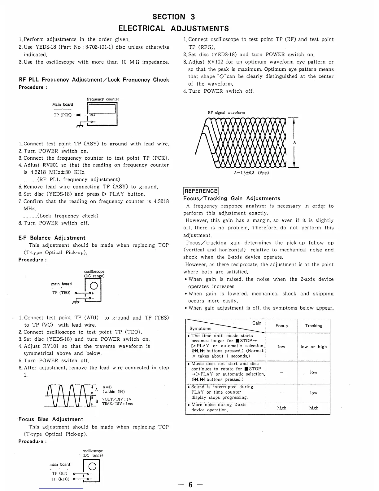 Sony CDP-M18 - SECTION 3 ELECTRICAL ADJUSTMENTS; RF PLL Frequency Adjustment;Lock Frequency Check; E-F Balance Adjustment; Focus Bias Adjustment