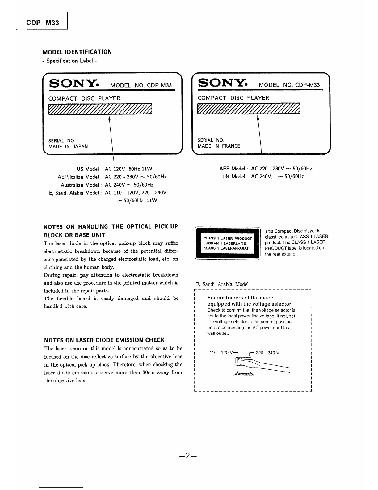 Sony CDP-M33 - MODEL IDENTIFICATION; Handling the Optical Pick-up Block; Laser Diode Emission Check