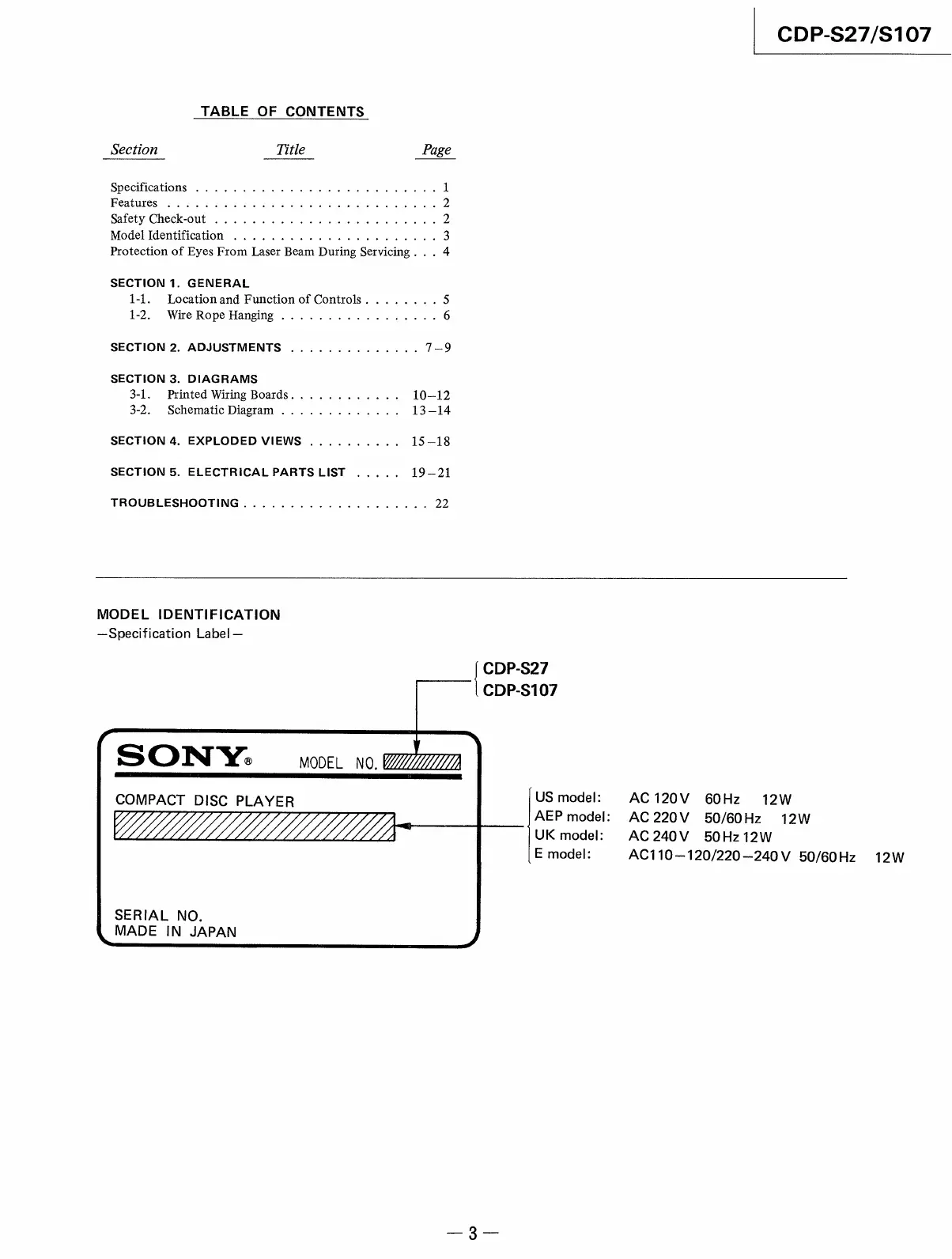 Sony CDP-S27 - Section 1. General; Controls: Location and Function; Section 2. Adjustments; Electrical Adjustments