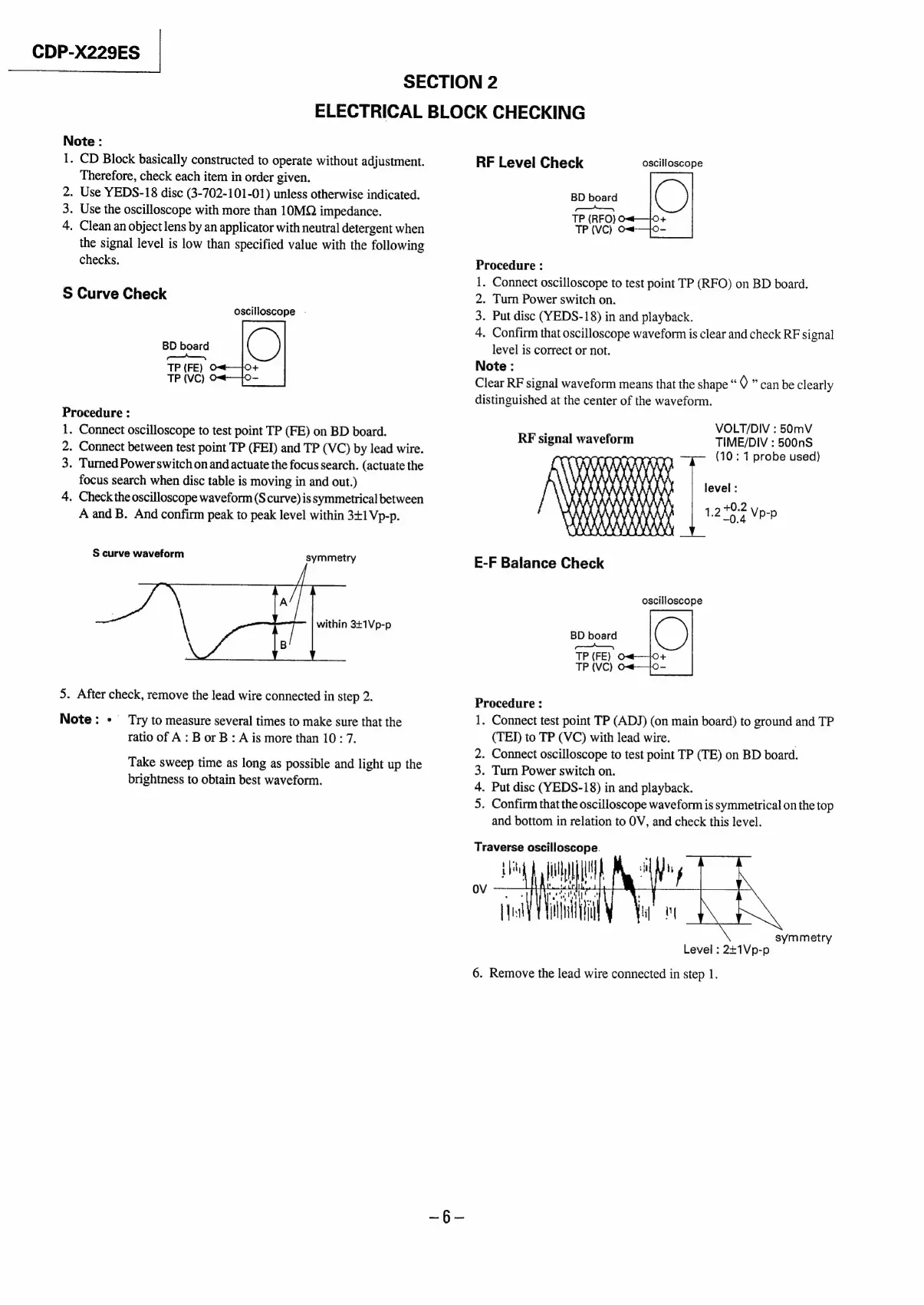 Sony CDP-X229ES - Electrical Block Checking; RF Level Check Procedure; S Curve Check Procedure; E-F Balance Check Procedure