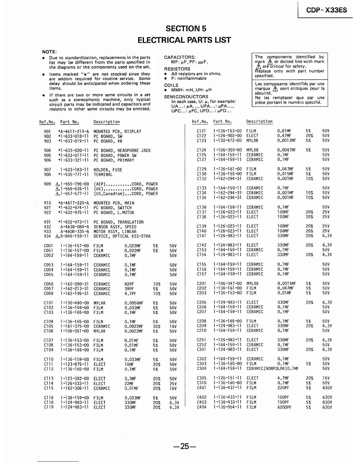 Sony CDP-X33ES - Section 5: Electrical Parts List; Capacitors and Resistors List; Coils and Semiconductor List