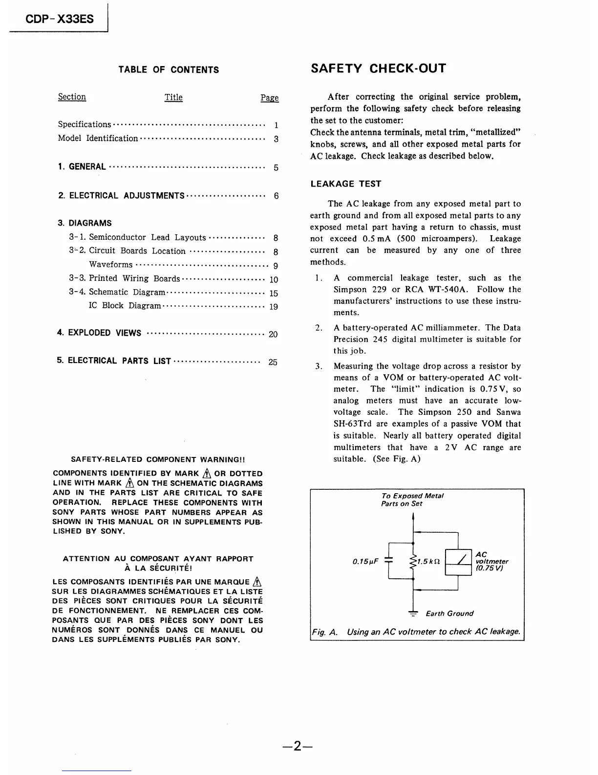 Sony CDP-X33ES - Table of Contents; Safety Check-Out; Leakage Test; Safety-Related Component Warning
