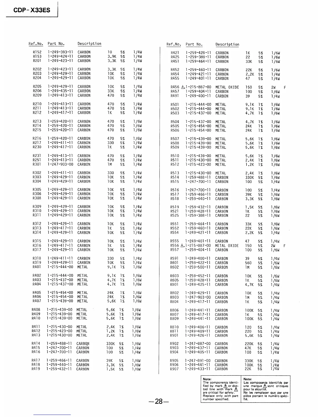 Sony CDP-X33ES - Section 5: Electrical Parts List (Continued); Resistors List (Continued)