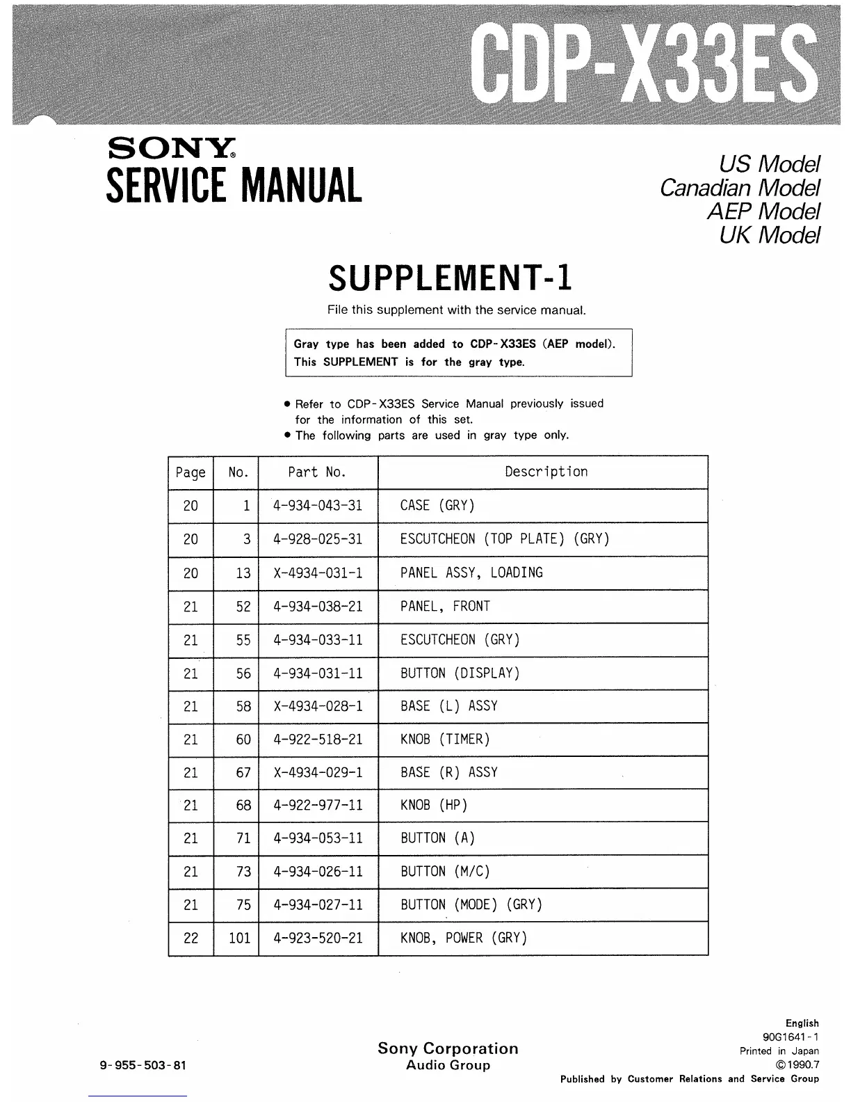 Sony CDP-X33ES - Supplement-1; Part Number Updates for Gray Type