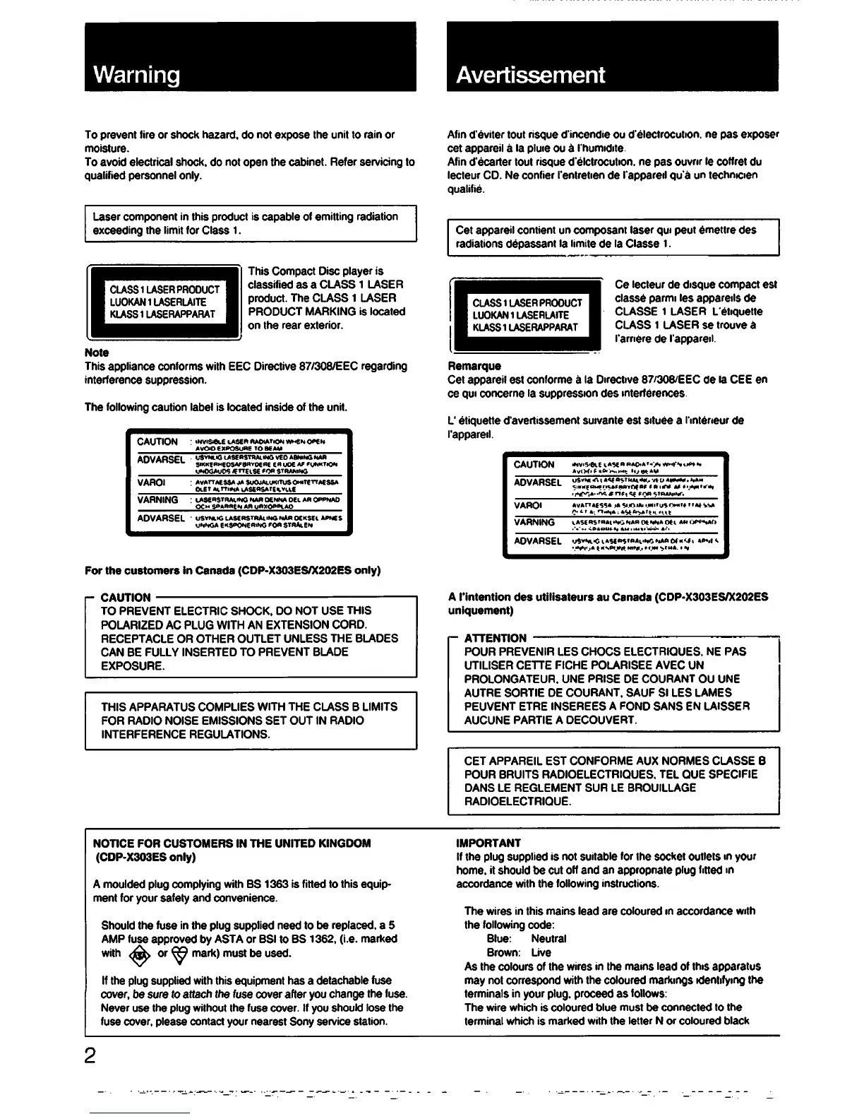 Sony CDP-X505ES - Safety Warnings
