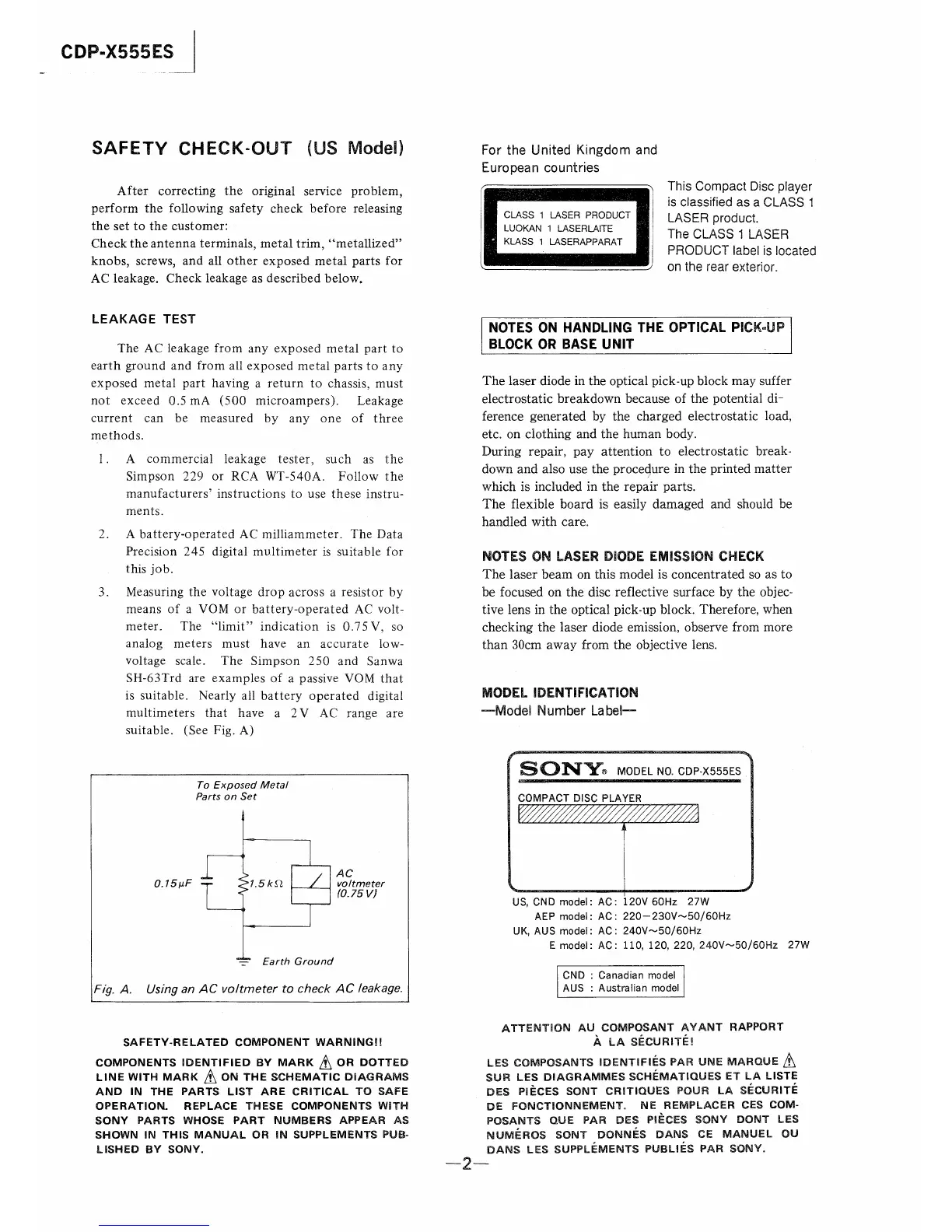 Sony CDP-X555ES - SAFETY CHECK-OUT (US Model); Leakage Test Procedure; Optical Pick-Up Block Handling; Laser Diode Emission Check