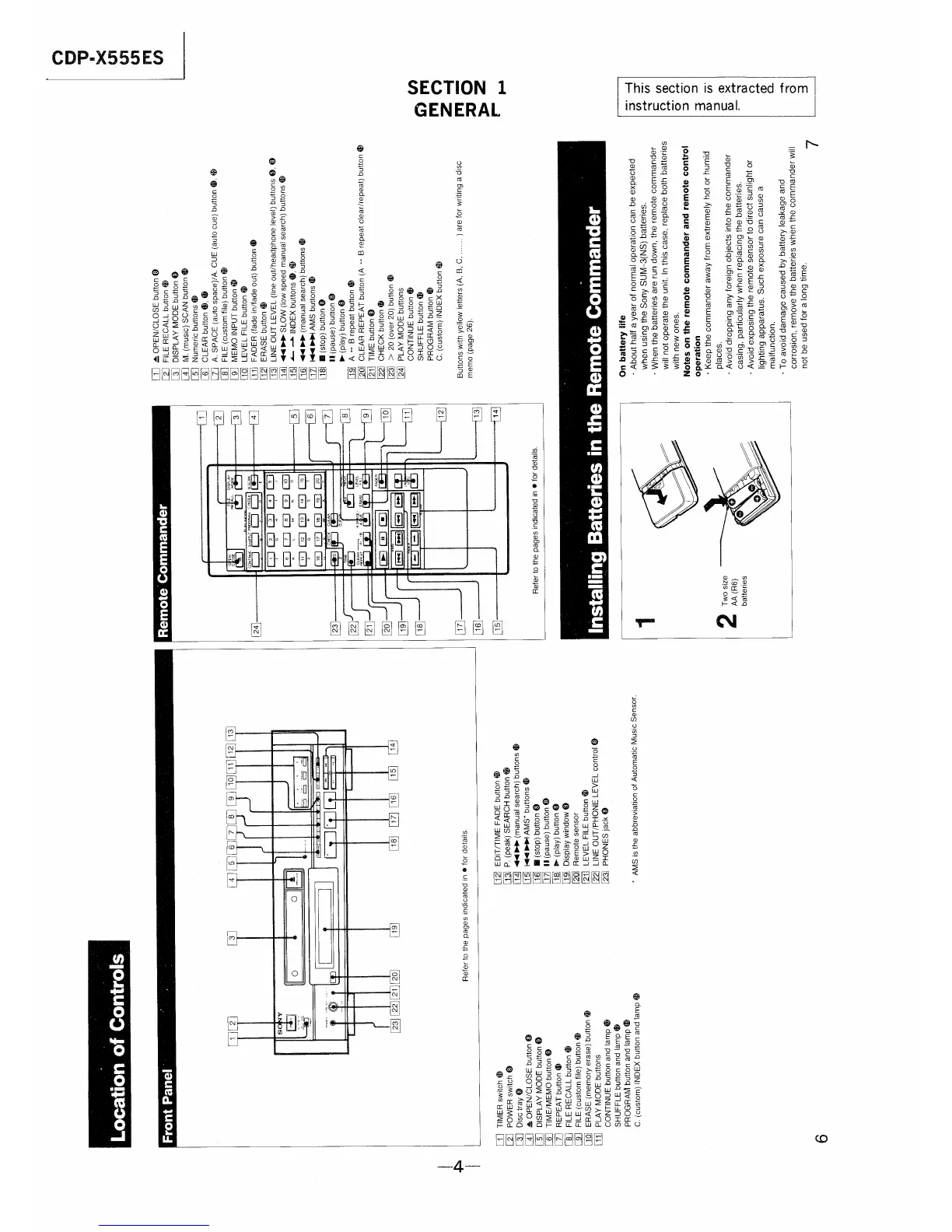 Sony CDP-X555ES - Location of Conrols; Front Panel; Remote Control