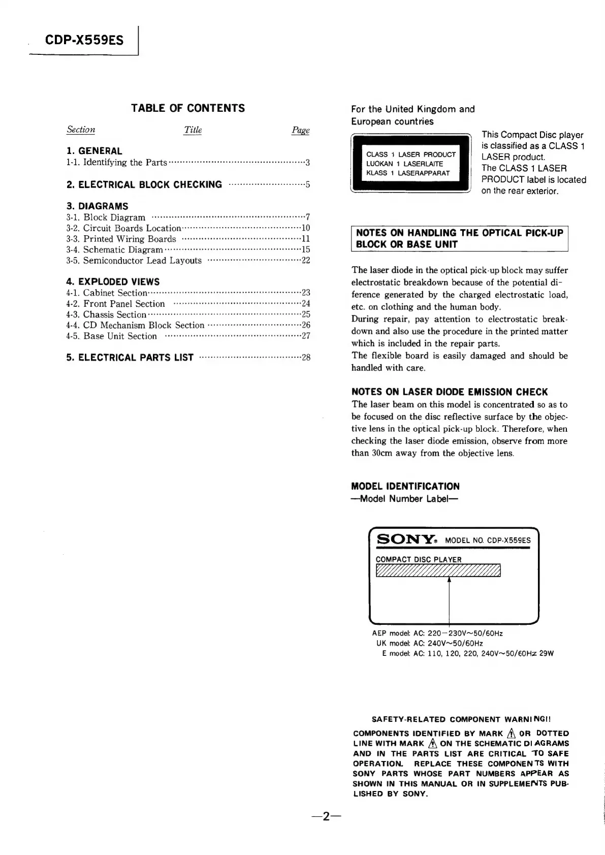 Sony CDP-X559ES - Notes on Handling the Optical Pick-Up Block or Base Unit; Notes on Laser Diode Emission Check; Model Identification