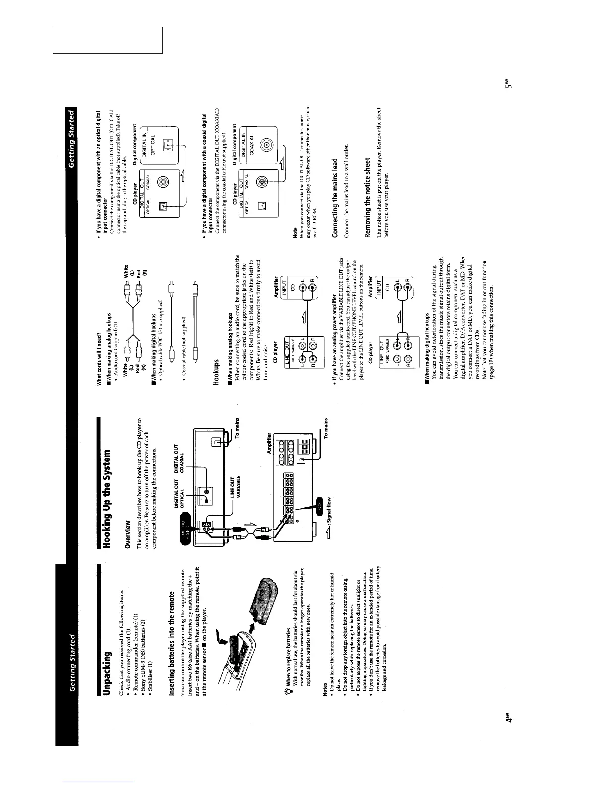 Sony CDP-XA50ES - 2 General; Getting Started; Unpacking; Hooking up the System