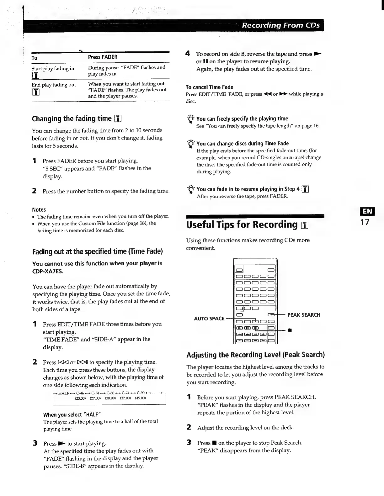 Sony CDP-XA7ES - Time Fade Recording; Recording Tips; Adjusting Recording Level