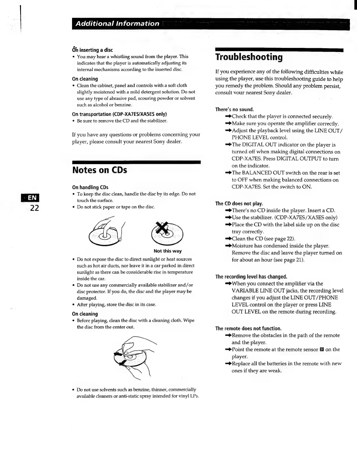 Sony CDP-XA7ES - CD Handling and Cleaning; Troubleshooting Guide