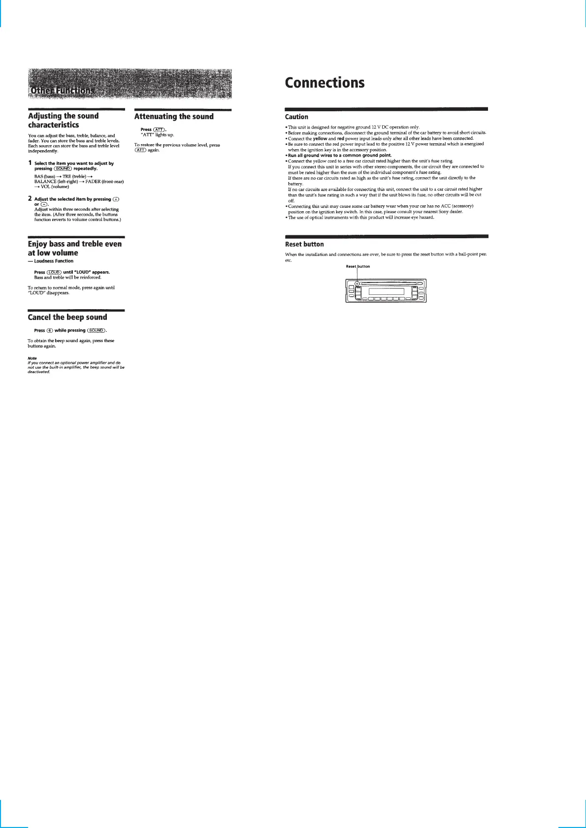 Sony CDX-1150 - Connections; Caution; Reset Button