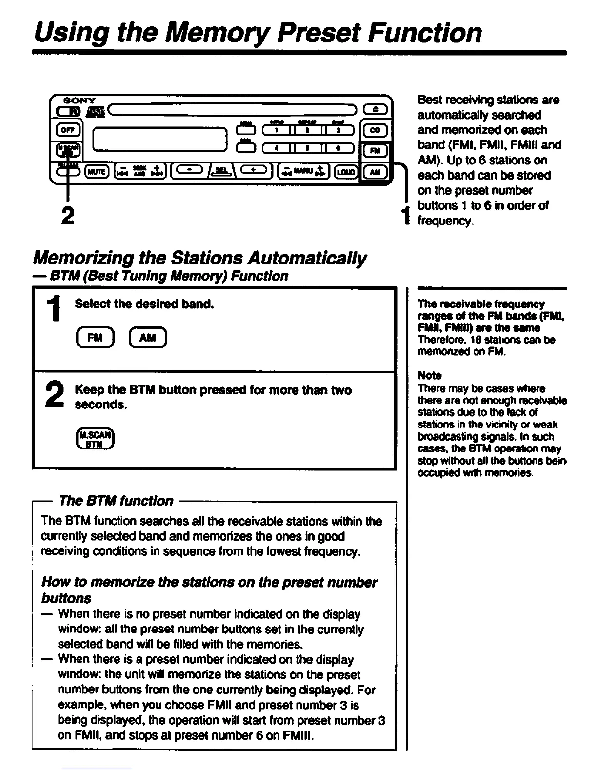 Sony CDX-5060 - Using the Memory Preset Function; Memorizing Stations Automatically - BTM (Best Tuning Memory) Function; How to Memorize Stations on the Preset Number Buttons