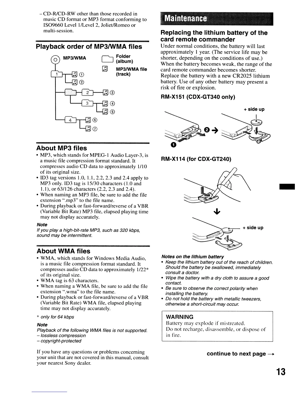 Sony CDX-GT340 - Maintenance; Playback Order of MP3;WMA Files; About MP3 Files; Replacing the Lithium Battery of the Card Remote Commander