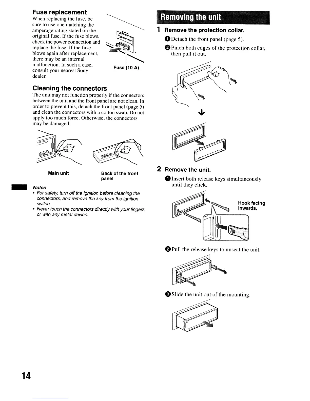 Sony CDX-GT340 - Removing the Unit; Fuse Replacement; Cleaning the Connectors