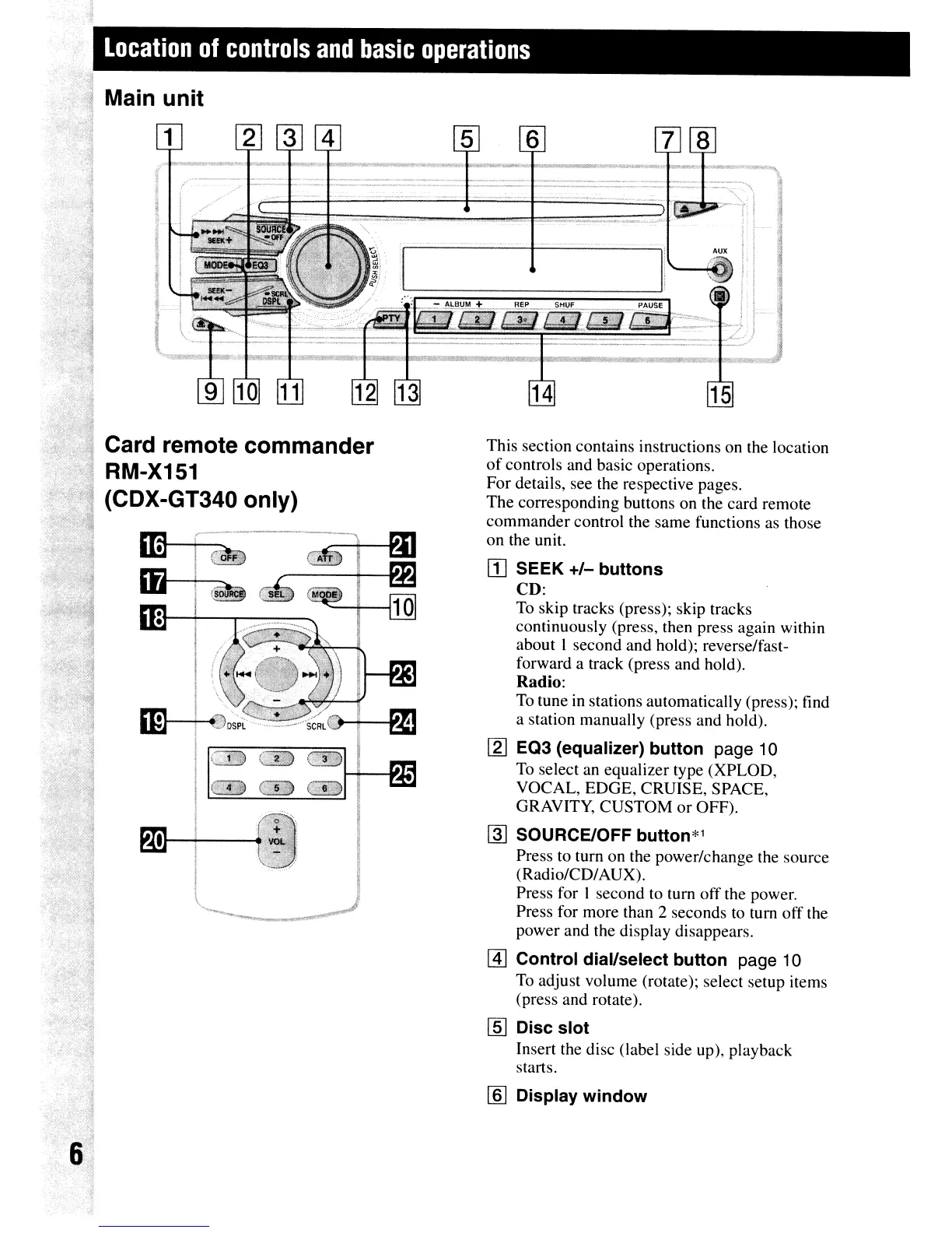 Sony CDX-GT340 - Location of Controls and Basic Operations; Main Unit; Card Remote Commander