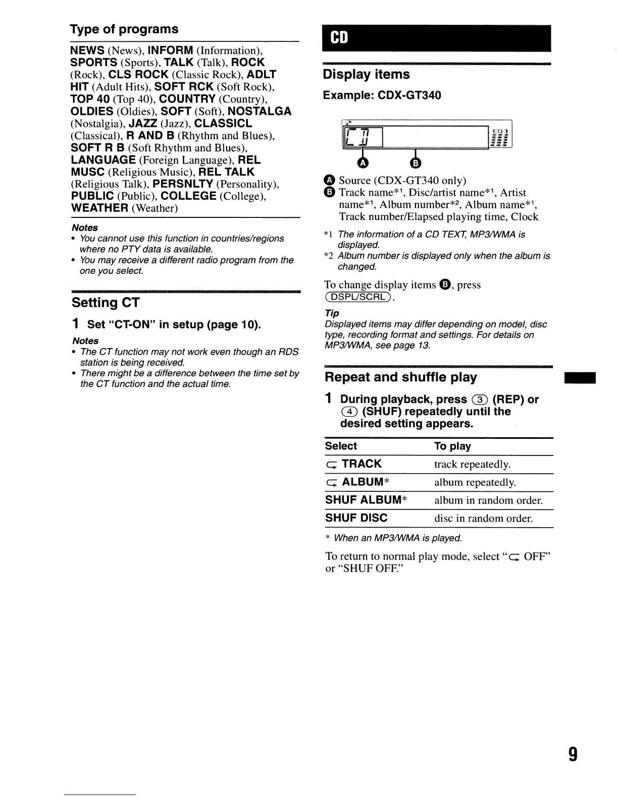 Sony CDX-GT340 - CD; Display Items; Setting CT; Repeat and Shuffle Play