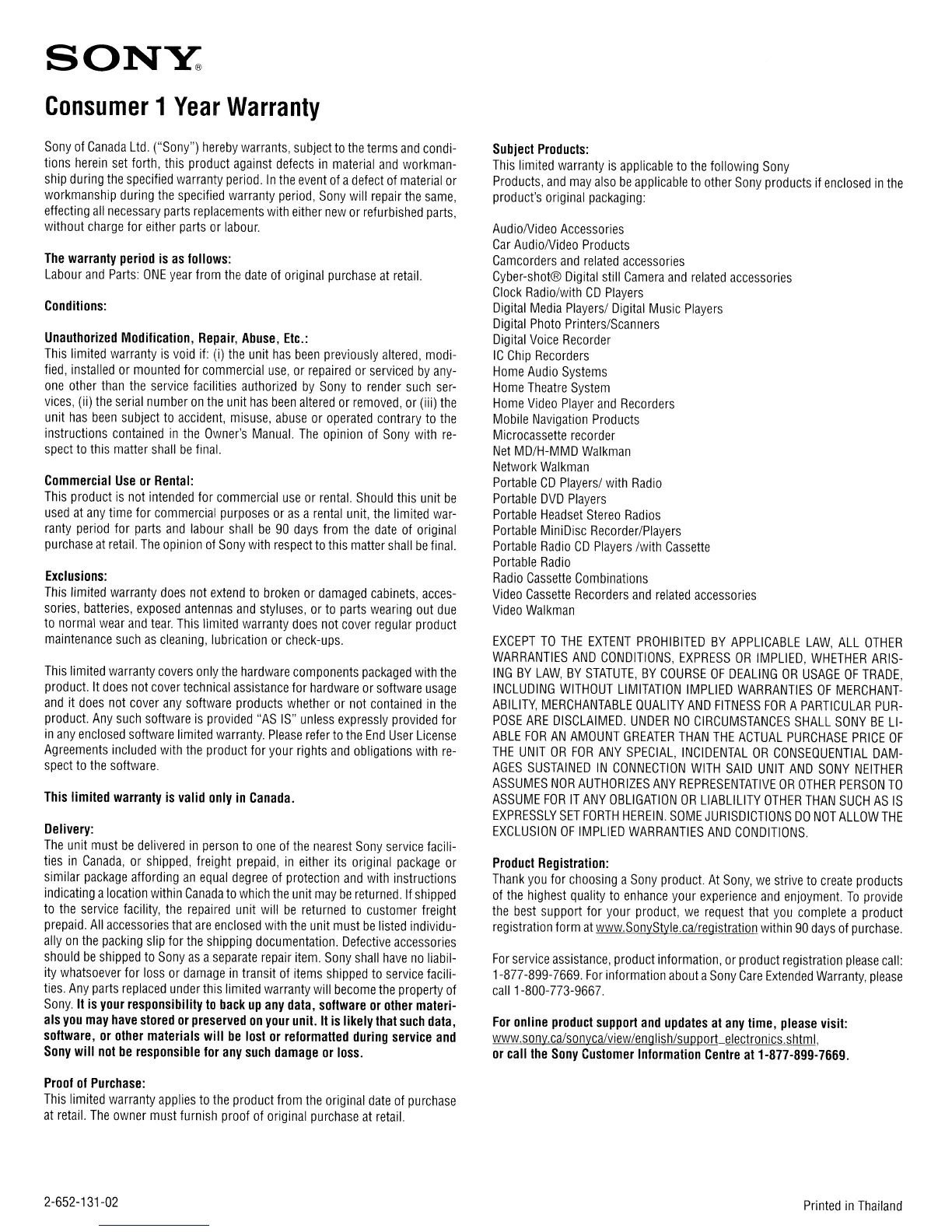 Sony CDX-GT930UI - Sony Consumer 1 Year Warranty (Canada)