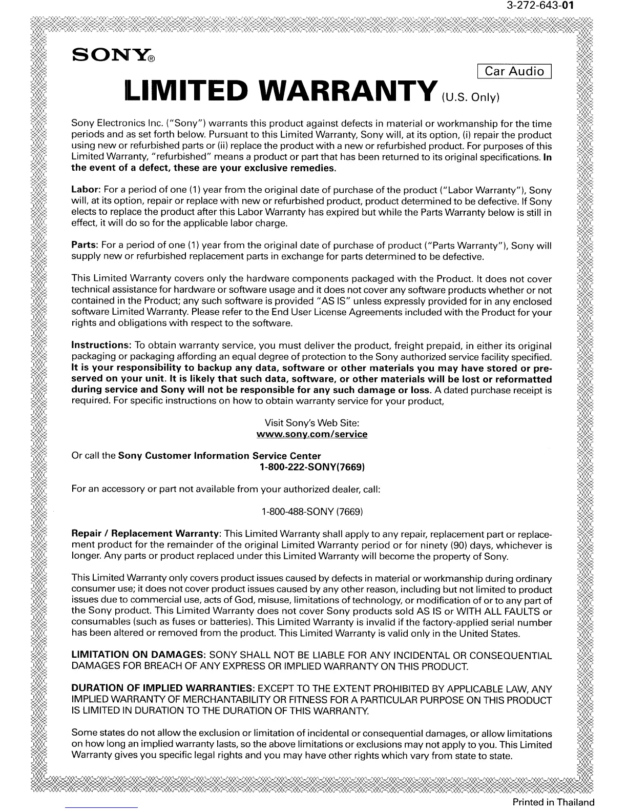 Warranty"), Sony