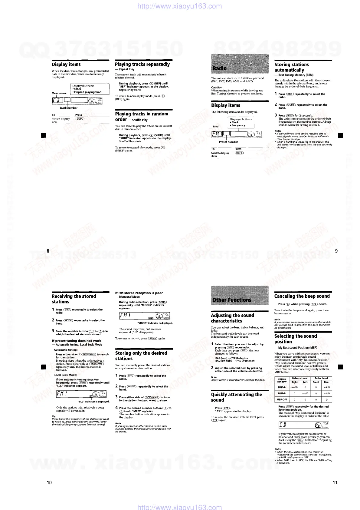 Sony CDX-L250 - Advanced Operation Features; Display, Track Modes, and Radio Functions; Sound Adjustment and Listening Preferences