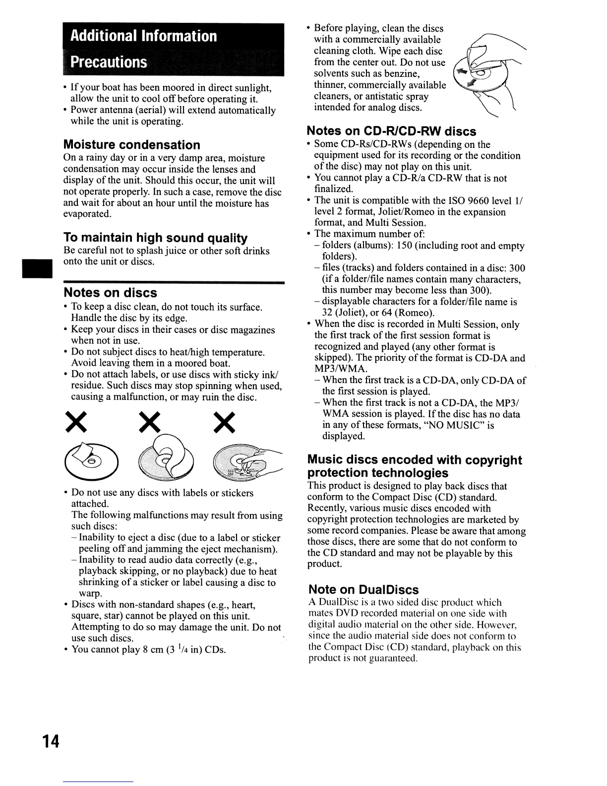 Sony CDX-M10 - Additional Information; Precautions and Disc Handling