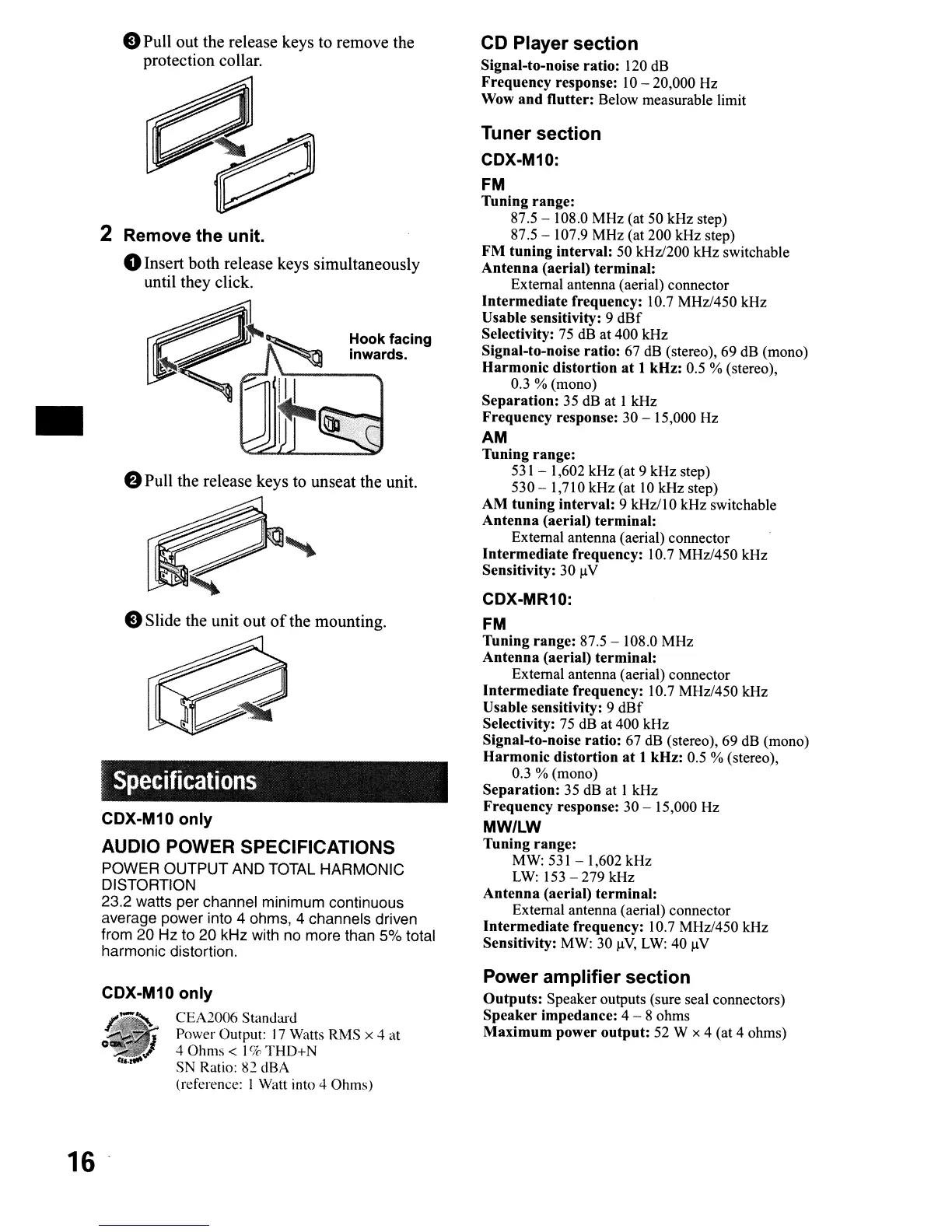 Sony CDX-M10 - Product Specifications; Technical Specifications Summary