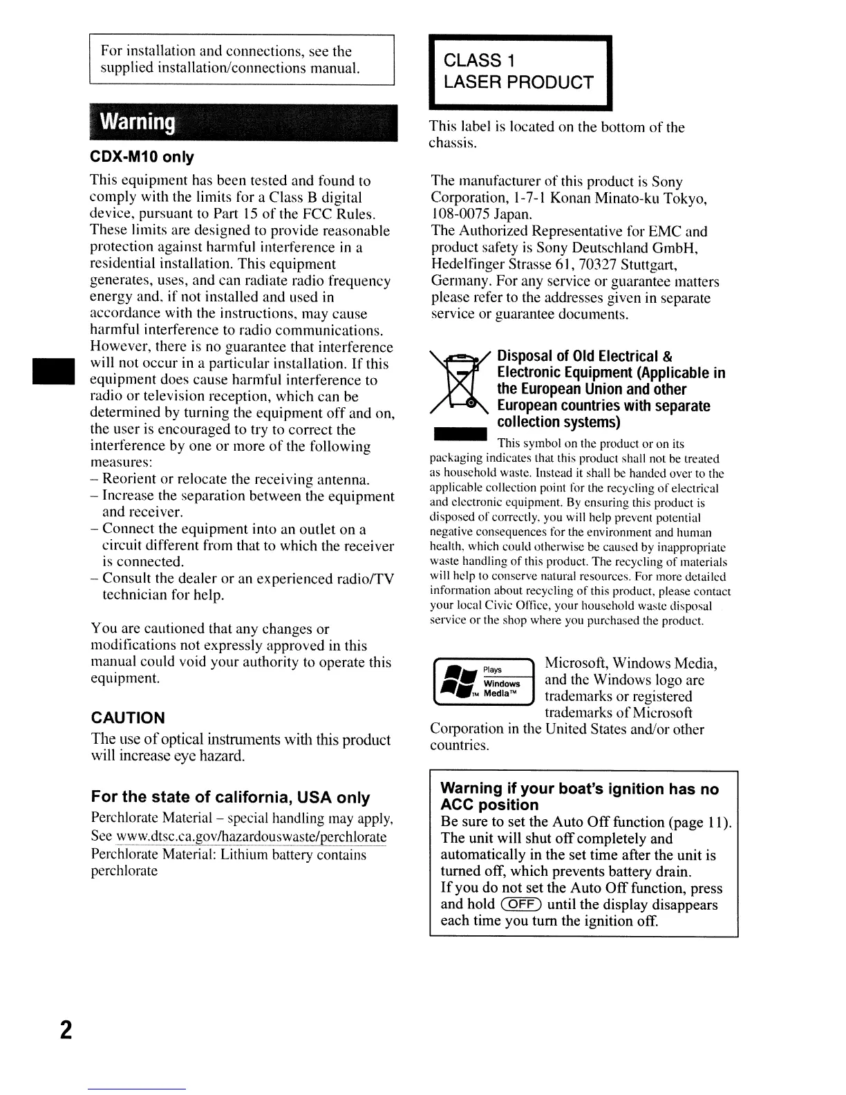 Sony CDX-M10 - Safety and Compliance; Regulatory Compliance and Warnings