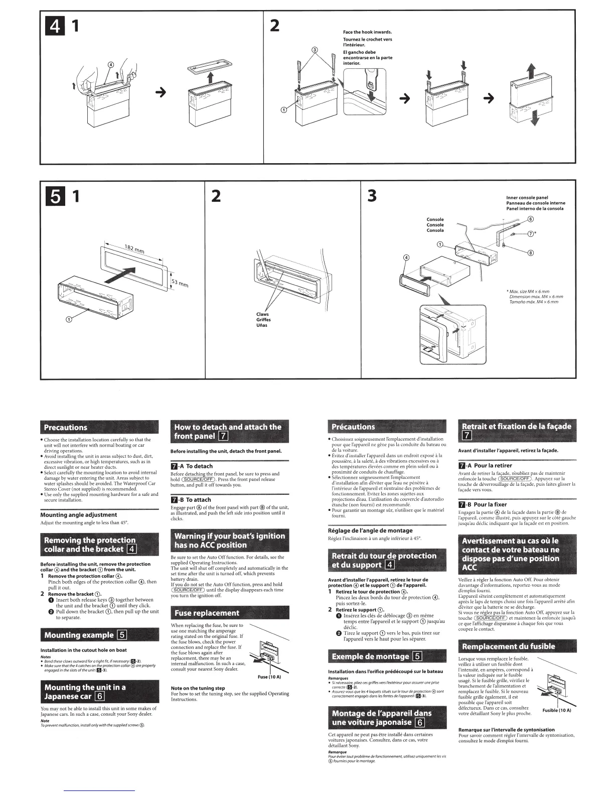 Sony CDX-M20 - Installation Procedures and Warnings; Removing Protection Parts; Front Panel Operations; Fuse Replacement and Ignition Warning