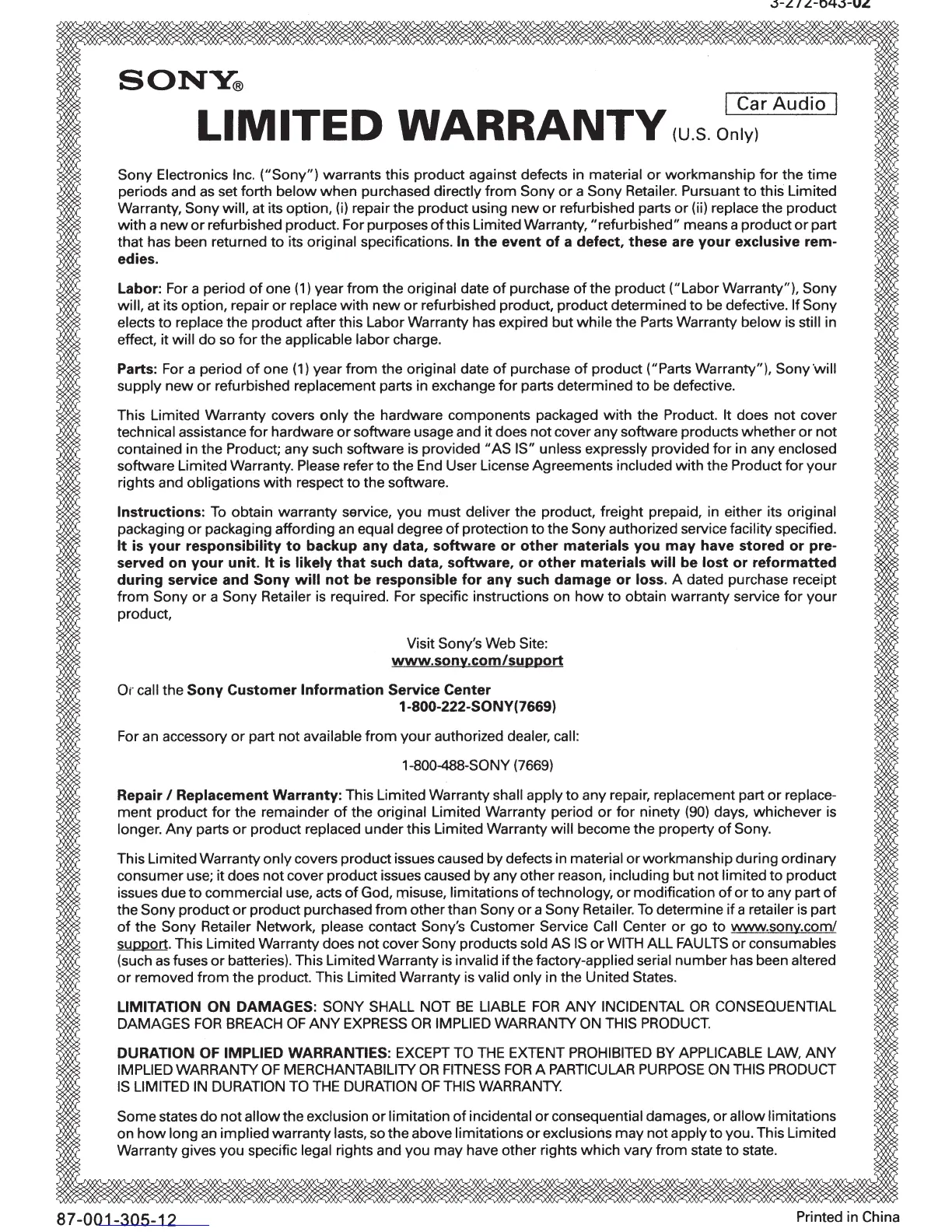 the product ("Labor Warranty"), Sony