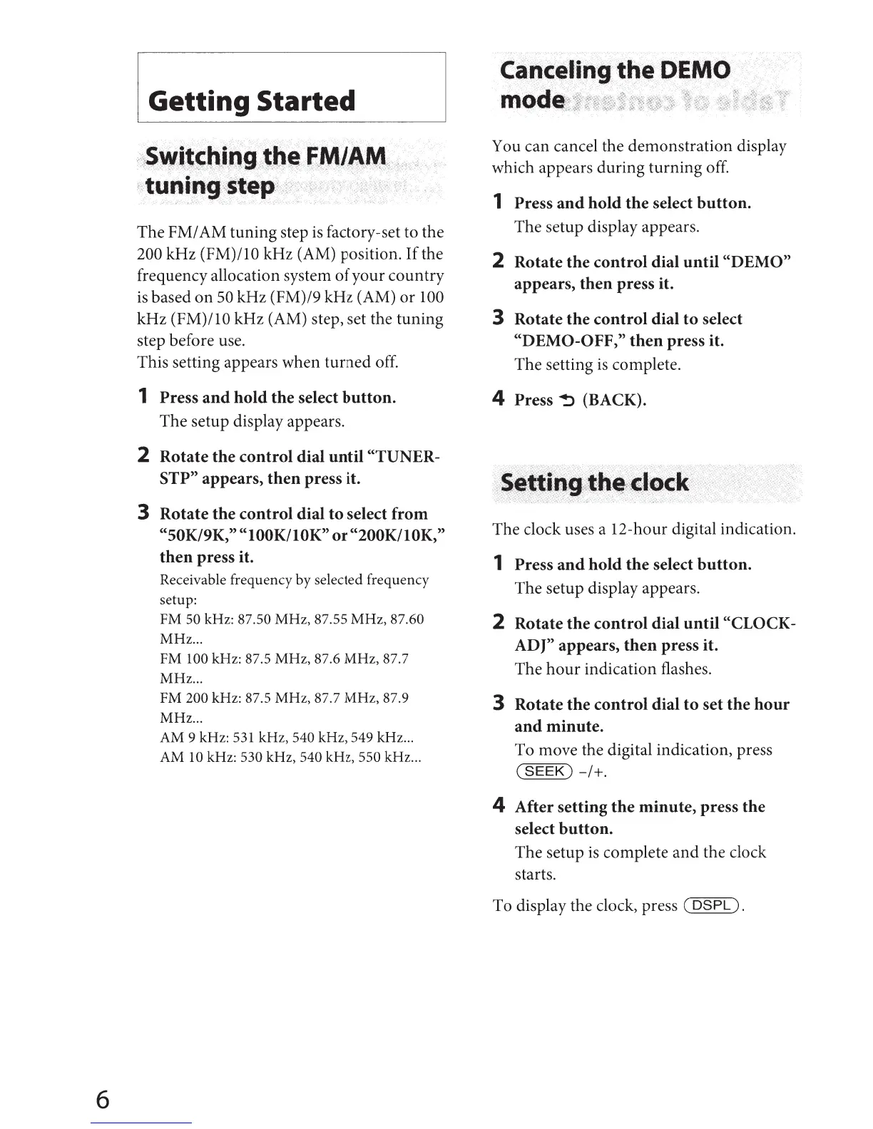 kHz (FM)/10 kHz (AM) step, set the tuning