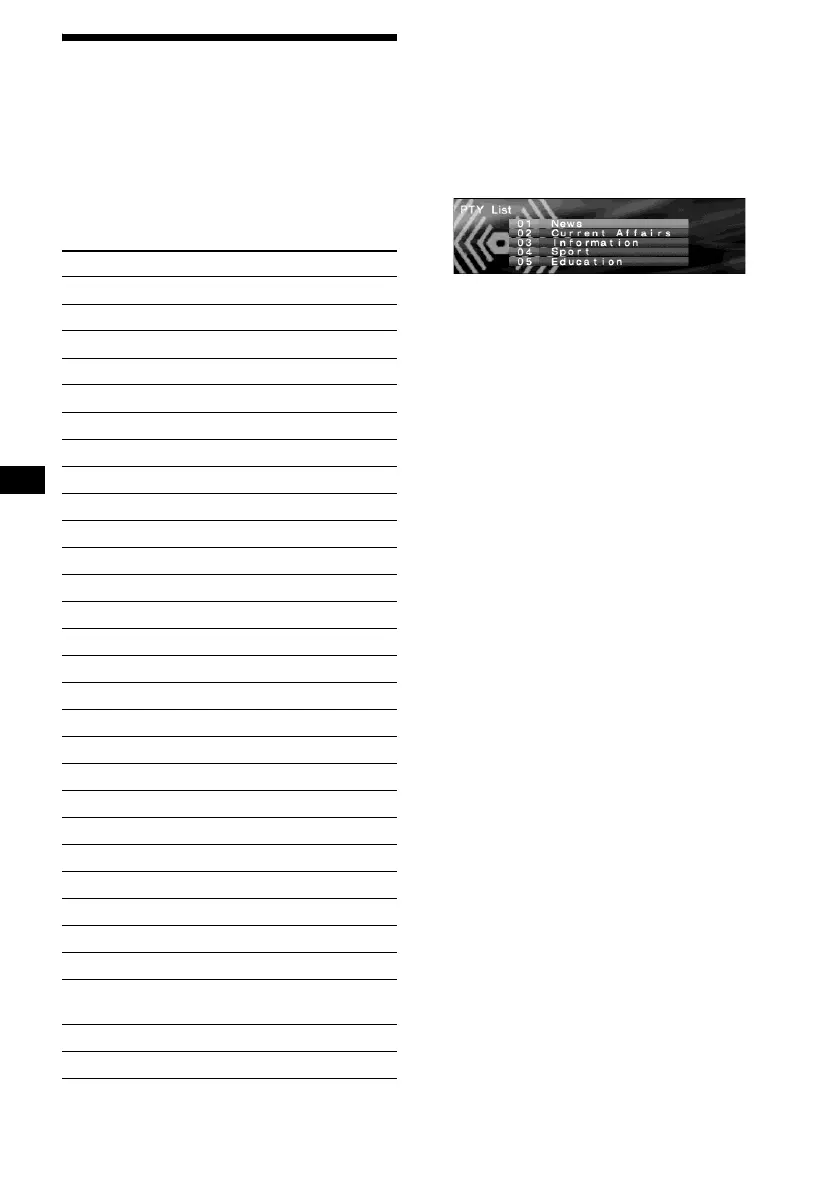 FM, premere (MENU), selezionare “PTY” in “List”,