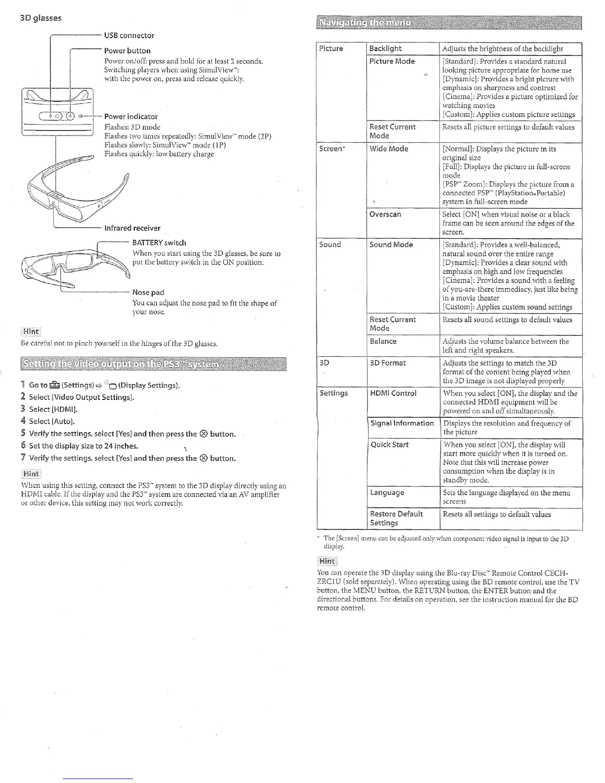 Sony CECH-ZED1U - 3 D Glasses Operation; Navigating the Menu; Picture Settings; Sound Settings