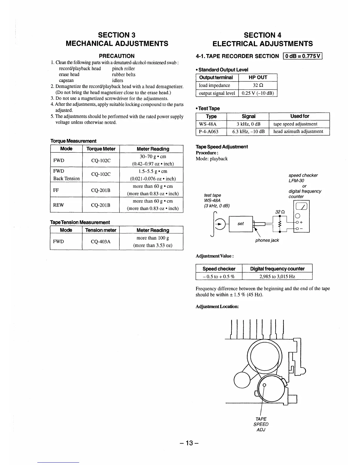 Sony CFD-101 - Section 3: Mechanical Adjustments; Section 4: Electrical Adjustments; Tape Recorder Section Adjustments