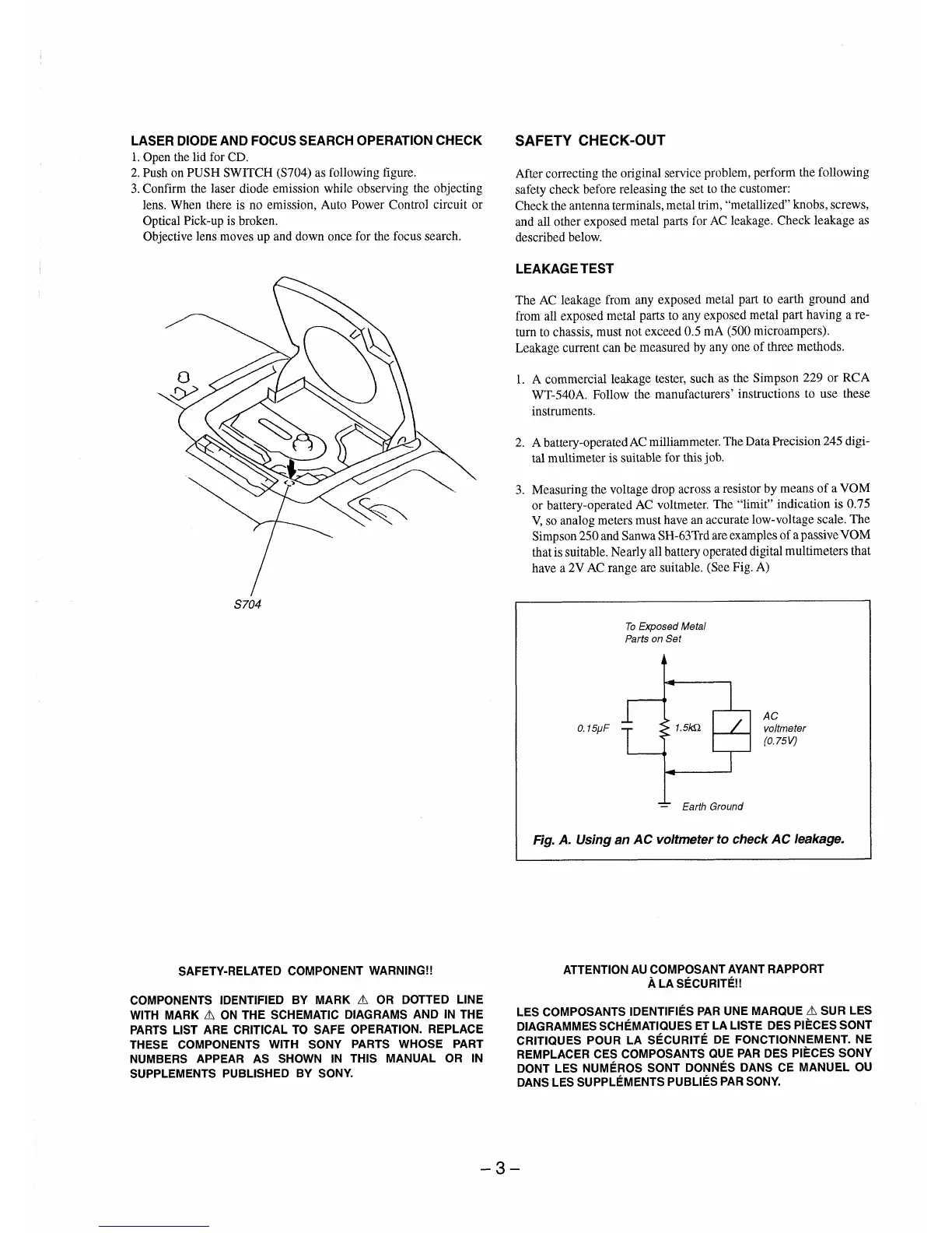 Sony CFD-101 - Operation Checks and Safety Procedures; Laser Diode and Focus Search Operation Check; Safety Check-out and Leakage Test