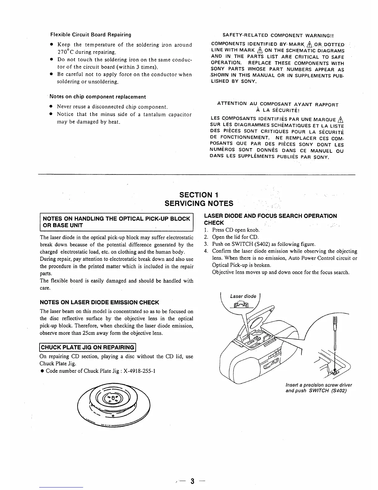 Sony CFD-340 - SECTION 1 SERVICING NOTES; Handling Optical Components and Safety Precautions